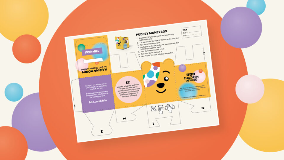 Whether you’re collecting cash for a sponsorship challenge or asking for donations at your nursery’s door, keep a track of your fundraising money in our DIY Pudsey moneybox. It’s super easy to cut out and build!